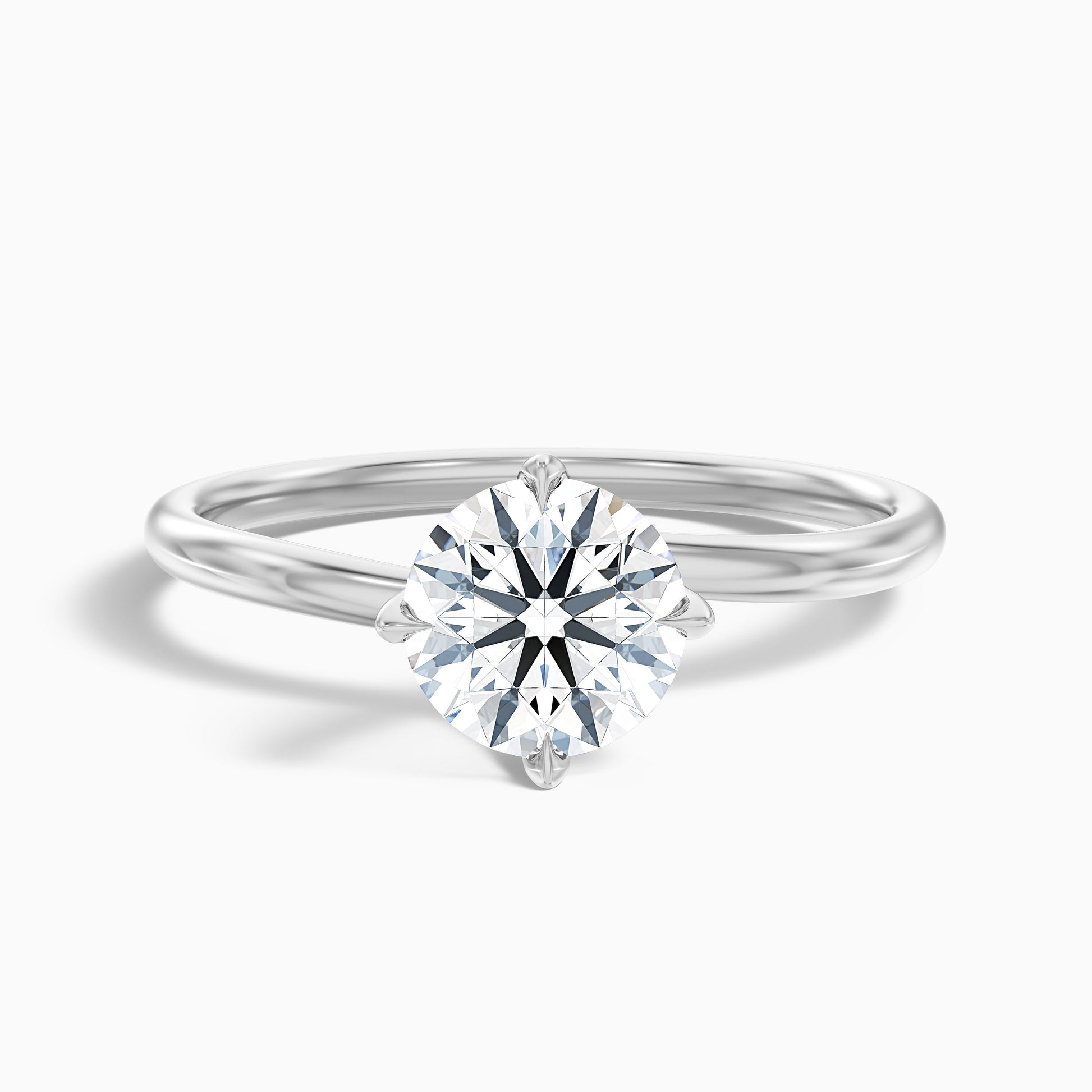 A classic round solitaire moissanite ring. Showcasing a brilliant round moissanite, this solitaire setting emphasizes pure sparkle. Find your perfect ring in 925 silver, platinum, or luxurious 10k, 14k, or 18k white, yellow, or rose gold. Available in a range of carat sizes.