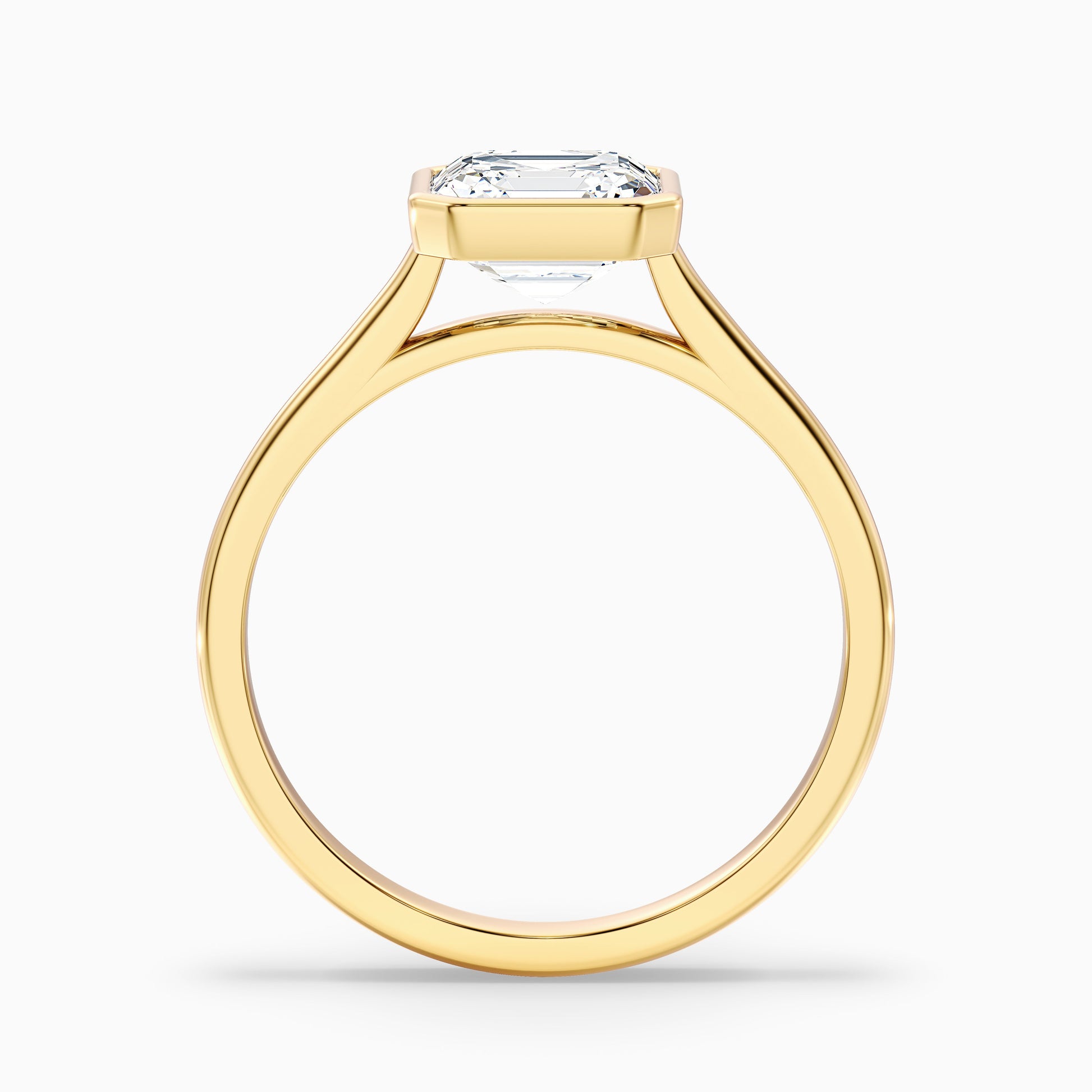 A sleek asscher cut bezel set solitaire moissanite ring. This modern design secures a beautiful asscher cut moissanite within a smooth metal frame. Available in 925 silver, platinum, or 10k, 14k, or 18k white, yellow, rose gold. Choose from various carat sizes for a contemporary and secure ring.