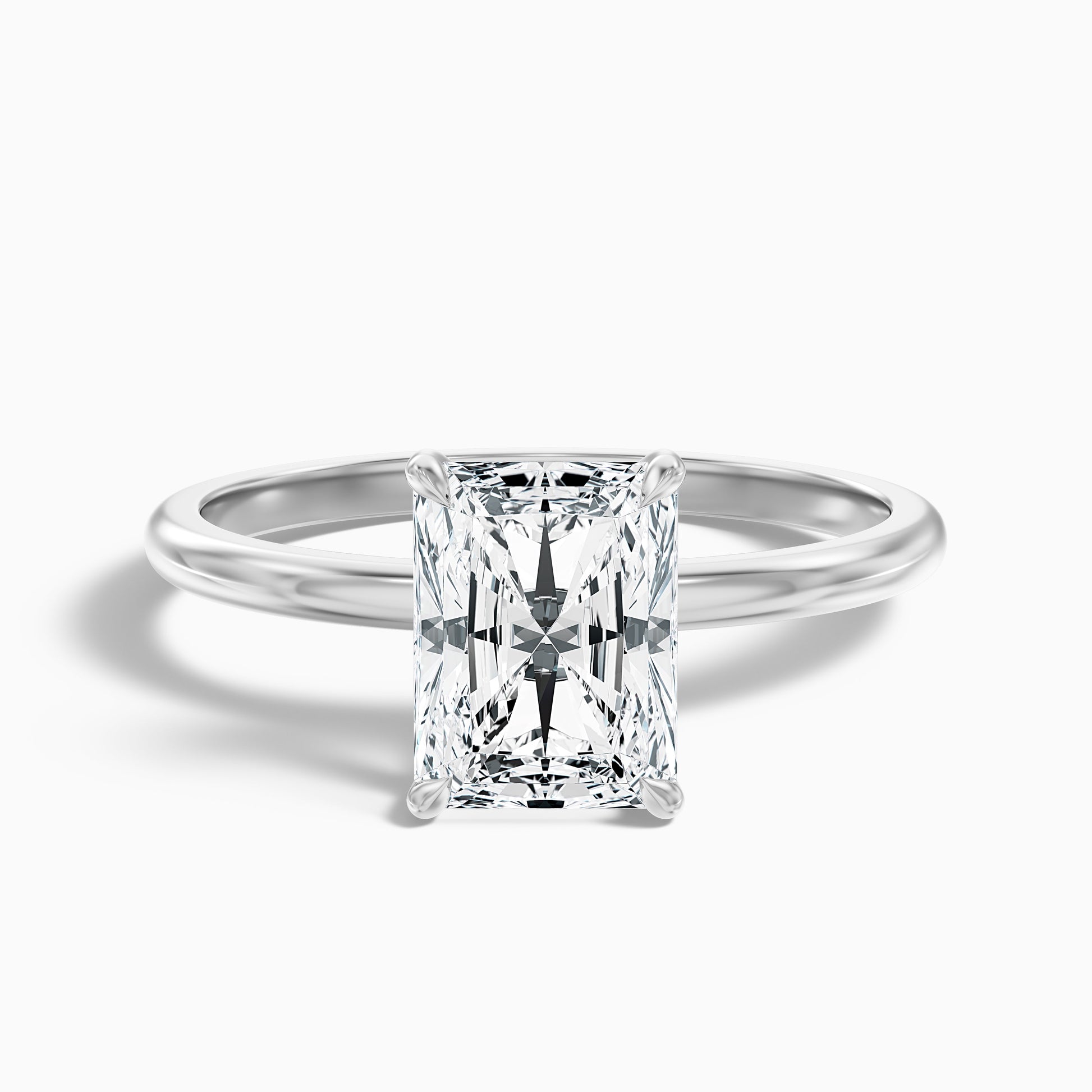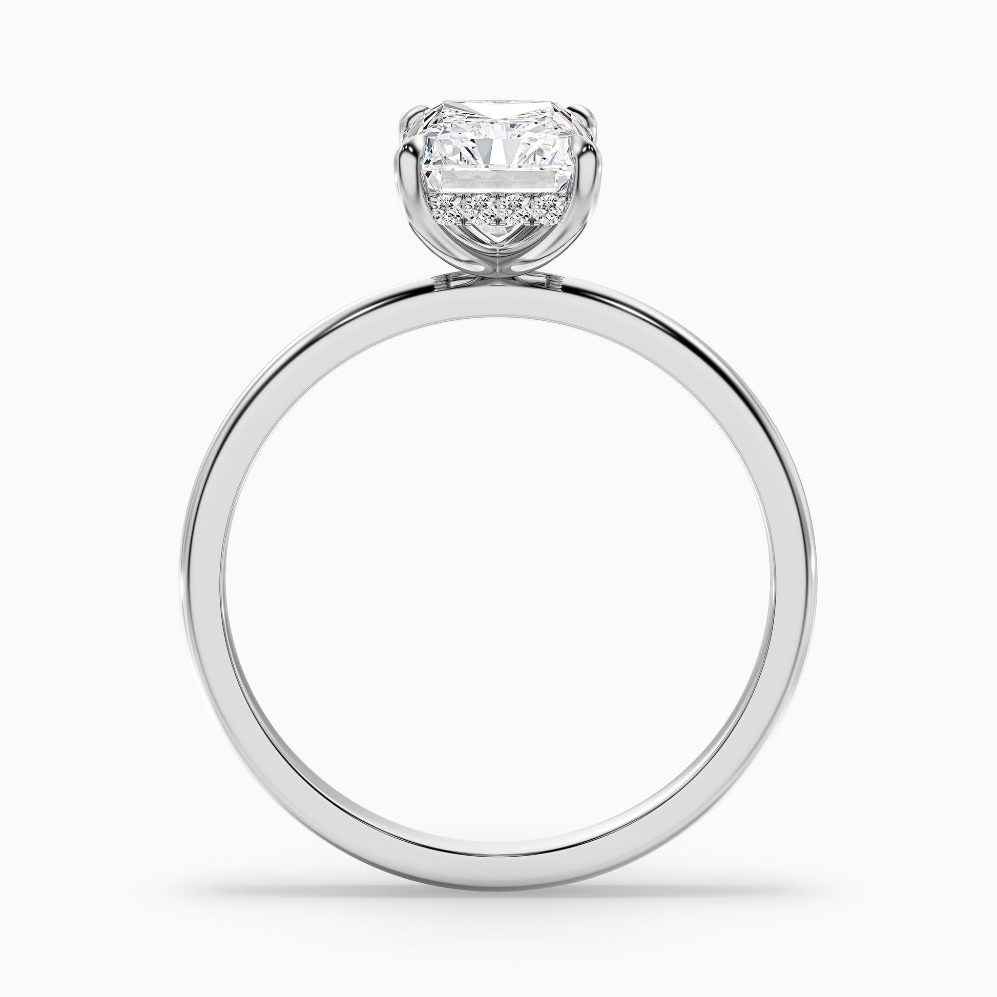This radiant cut hidden halo lab grown diamond ring offers a secret sparkle. Features a beautiful radiant cut lab grown diamond with a subtle hidden halo beneath. Available in 925 silver, platinum, or 10k, 14k, 18k white, yellow, rose gold. Choose from various carat sizes for a ring with delightful detail.