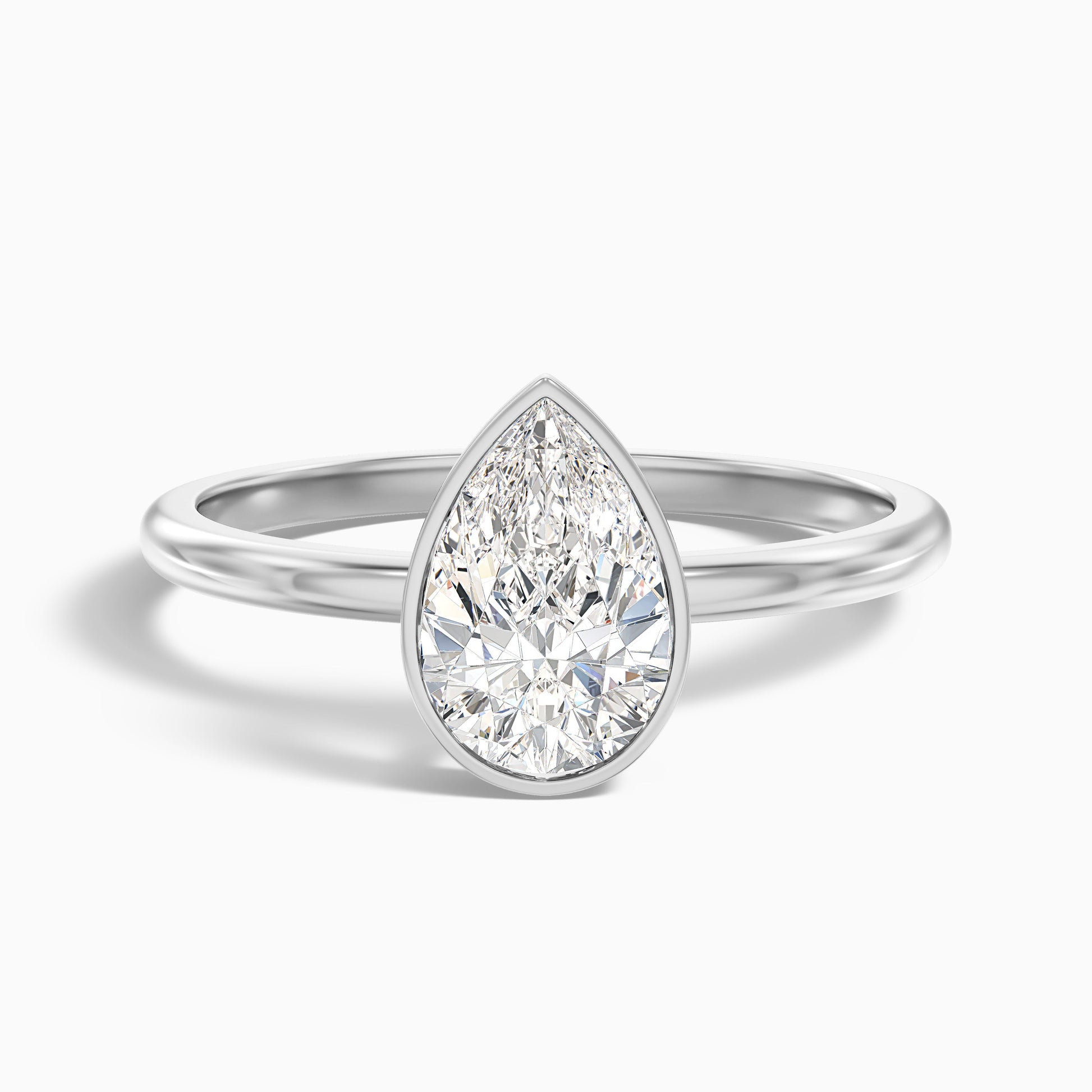 The Caitlyn pear cut bezel moissanite diamond engagement ring highlights a graceful pear-shaped moissanite held securely in a smooth bezel setting for a clean, modern look. Offered in 10k, 14k, or 18k gold, sterling silver, and platinum, this minimalist design enhances both safety and sophistication.