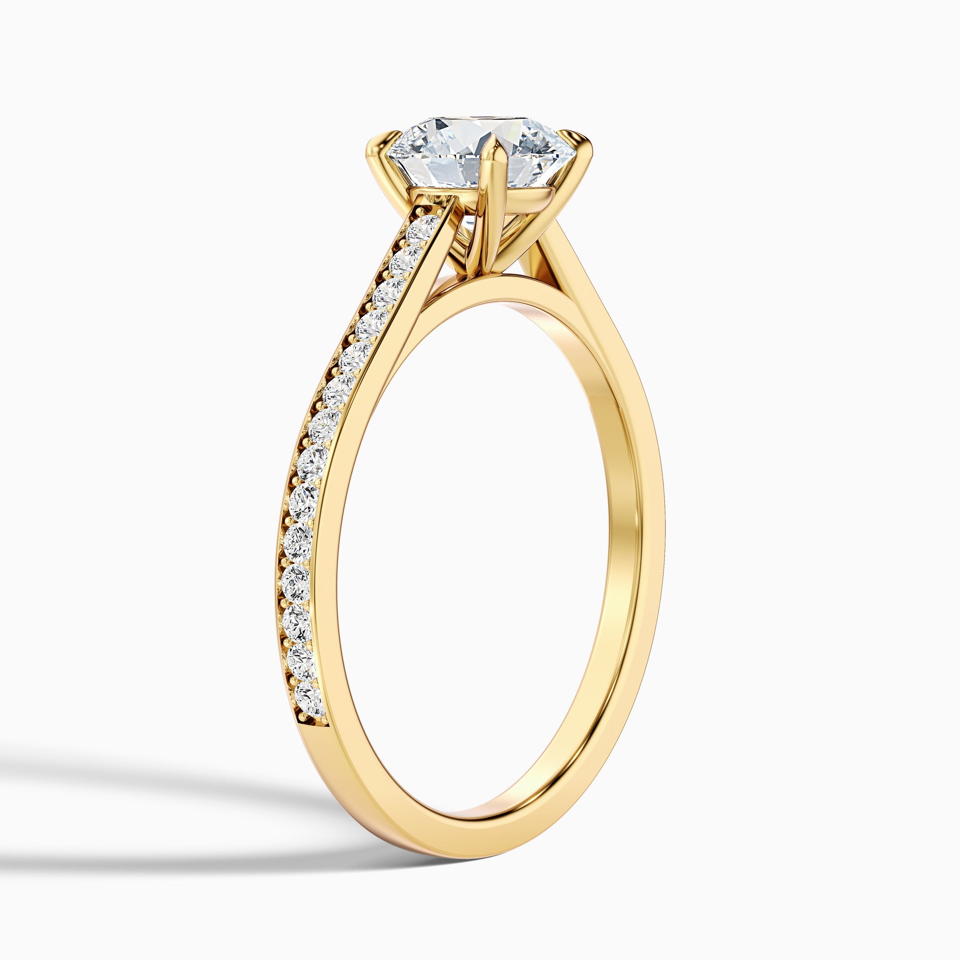 This round side stone channel set lab grown diamond ring combines beauty and style. Features a gorgeous round lab grown diamond with shimmering channel set side stones along the band. Crafted in 925 silver, or 10k, 14k, or 18k white, yellow, or rose gold. Available in various carat sizes for a sophisticated look.