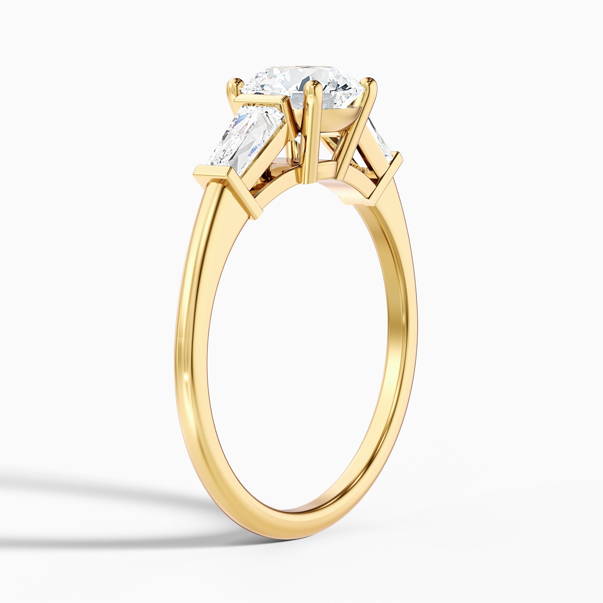 This round three stone with baguette lab grown diamond ring offers unique detail. A central round lab grown diamond is flanked by elegant baguette side stones. Expertly crafted in 925 silver, or 10k, 14k, or 18k white, yellow, or rose gold. Available in various carat sizes for a distinctive ring.