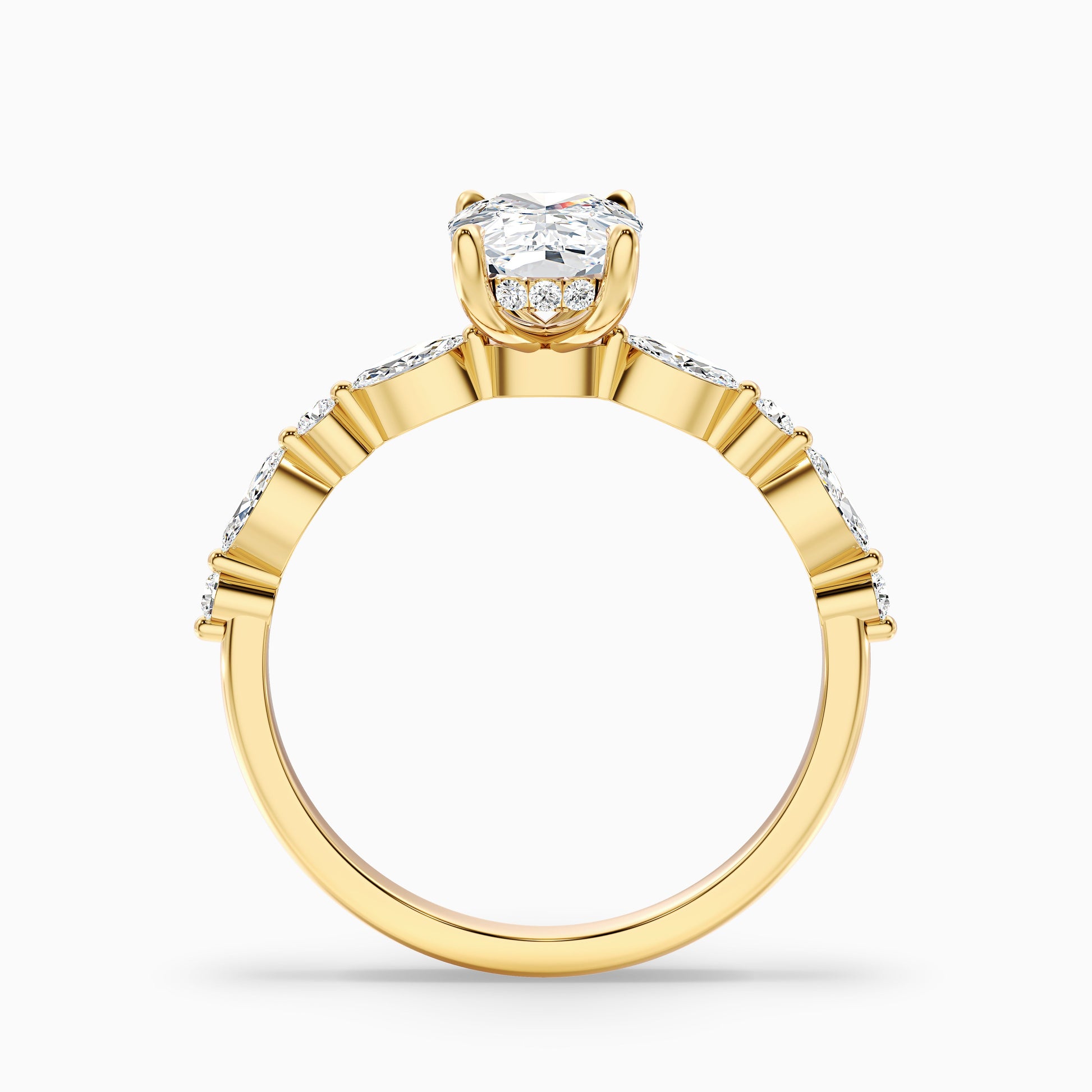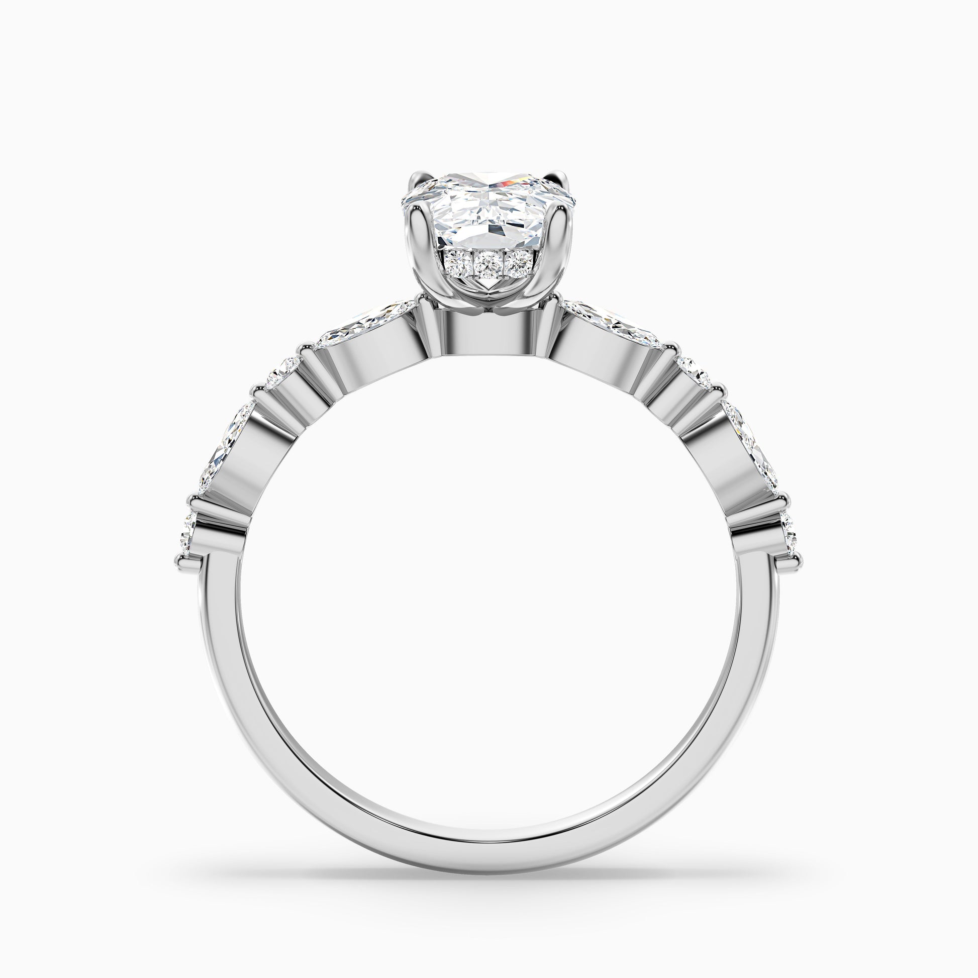 The Hailee elongated cushion cut lab grown diamond ring features a stunning center stone elevated by a hidden halo and sparkling pave-set diamonds along the shank. Offered in 10k, 14k, or 18k gold, sterling silver, and platinum, this ring combines elegance with modern sparkle. The elongated cushion cut provides a unique silhouette that flatters the hand.