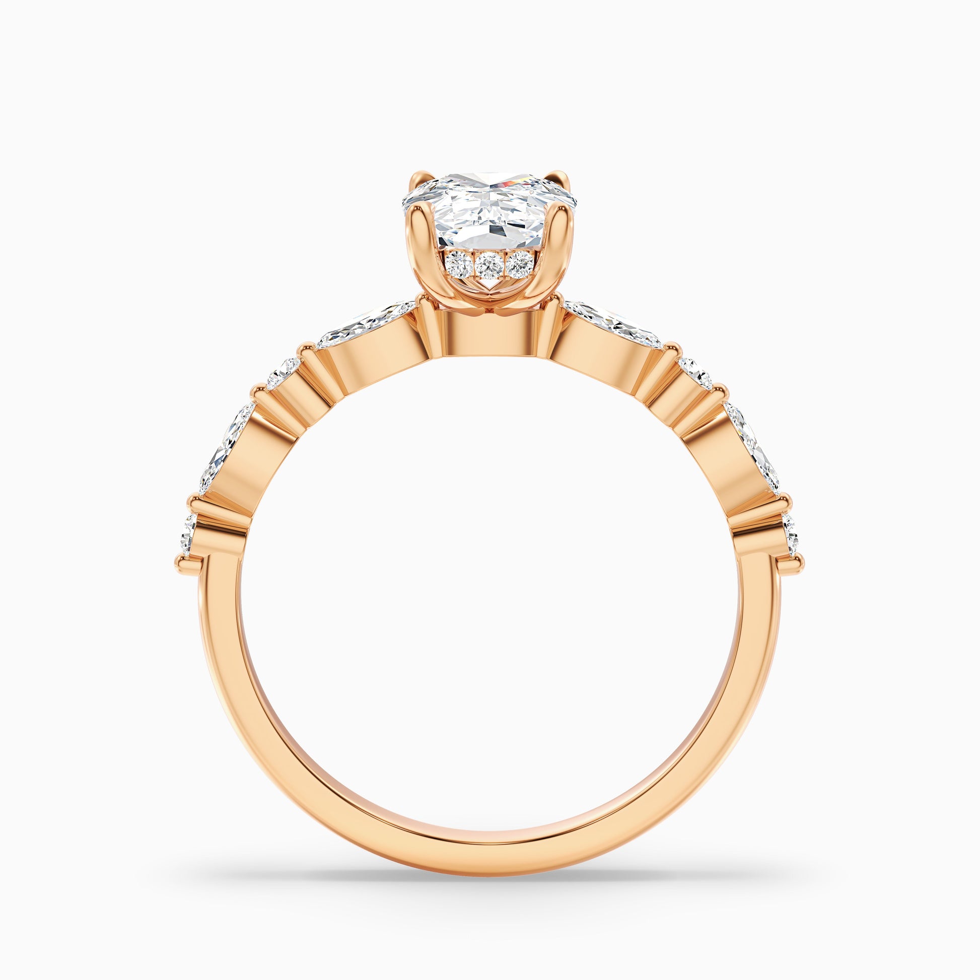 Moissanite’s high refractive index creates extraordinary fire, perfect for those who love radiant jewelry. The hidden halo increases visual size and brilliance, while the pave detailing wraps the band in light. Designed for comfort and daily wear, the Hailee ring is both luxurious and resilient—a true statement of love and style.