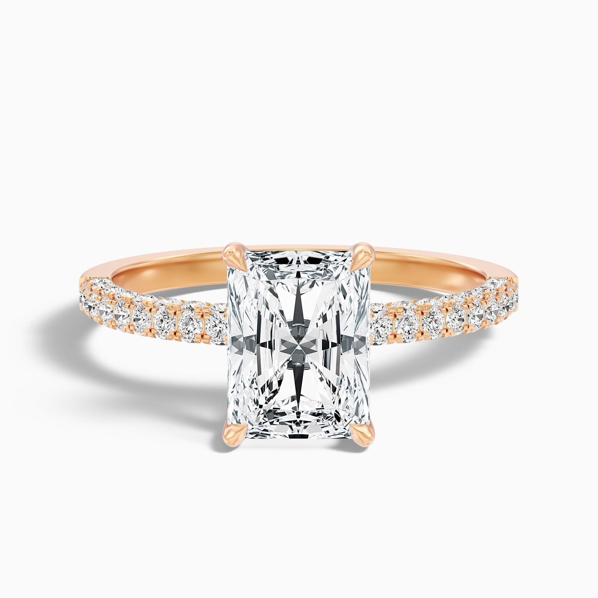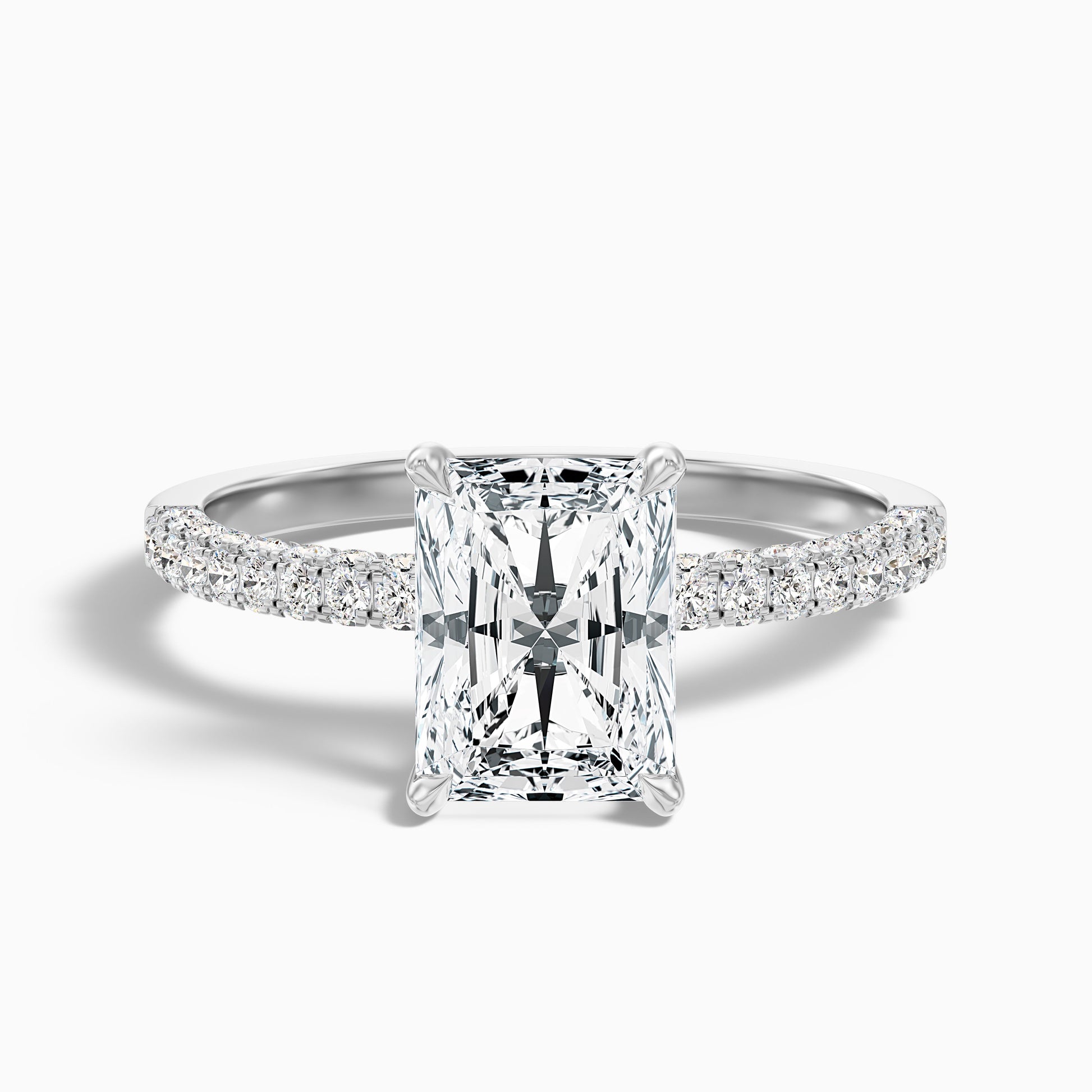 This radiant hidden halo side stone moissanite ring offers beautiful detail. Features a brilliant radiant cut moissanite with a hidden halo and sparkling side stones. Crafted in 925 silver, platinum, or 10k, 14k, or 18k white, yellow, or rose gold. Available in various carat sizes for a radiant look.