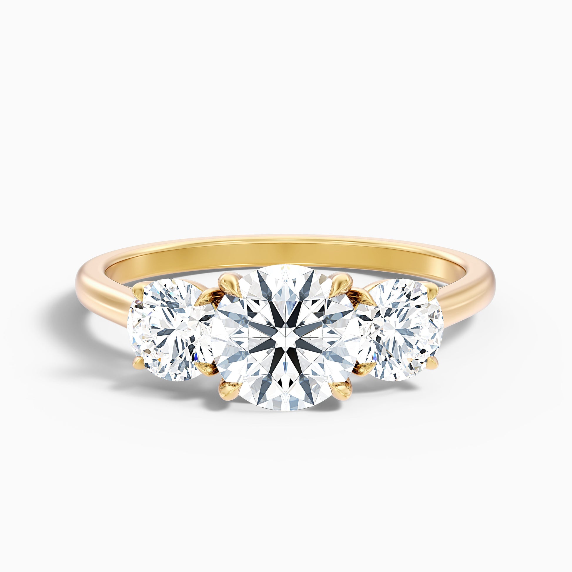 This round three stone lab grown diamond ring represents harmony. Features a beautiful central round lab grown diamond complemented by two side stones. Available in 925 silver, or 10k, 14k, or 18k white, yellow, or rose gold. Choose from various carat sizes for a balanced and beautiful design.