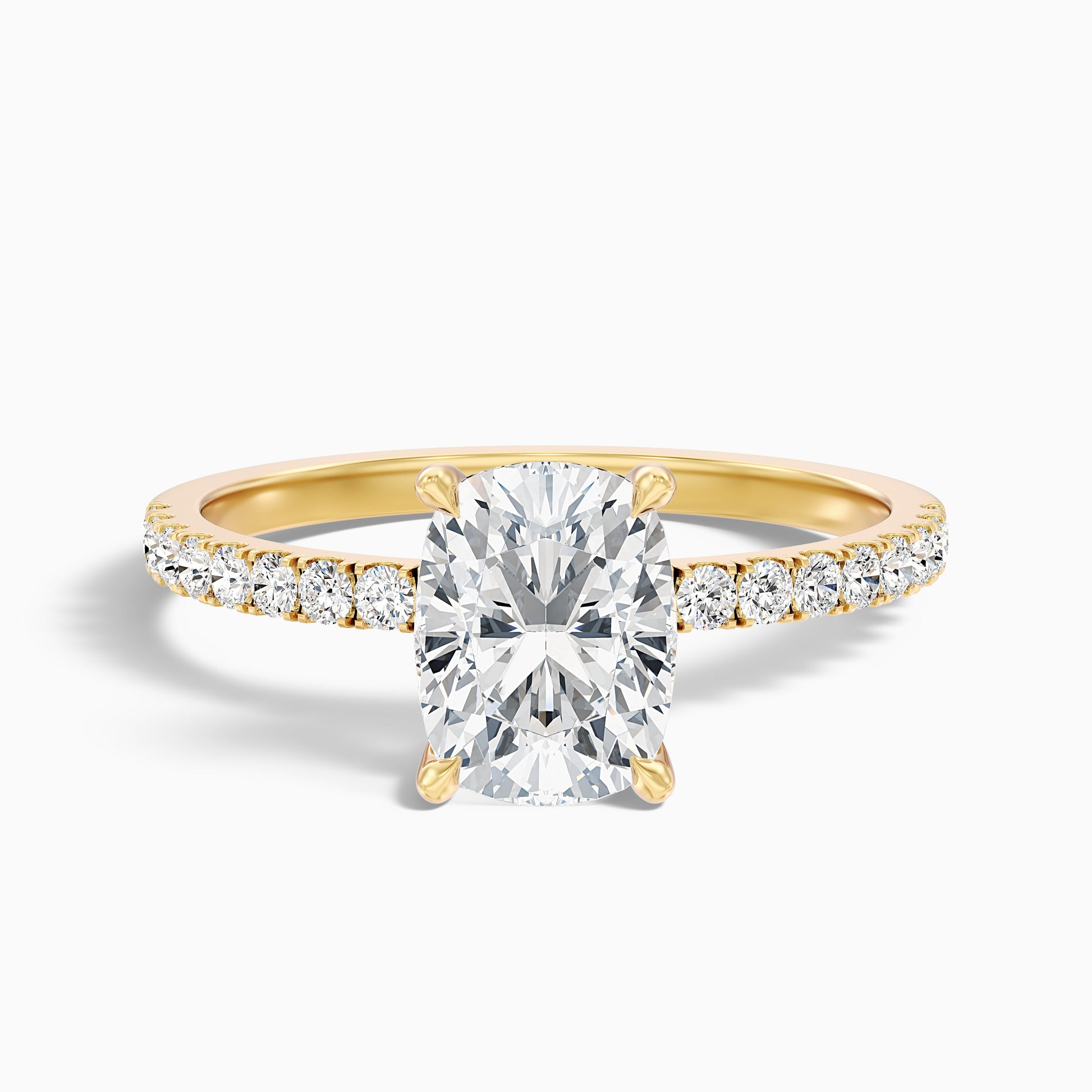 The Jennifer elongated cushion cut lab grown diamond ring showcases a brilliant center stone enhanced by a hidden halo and shimmering pave-set diamonds along the band. Crafted in 10k, 14k, or 18k white, yellow, or rose gold, plus sterling silver and platinum, this ring delivers continuous sparkle from every angle. The elongated cushion cut offers romantic appeal and graceful lines.