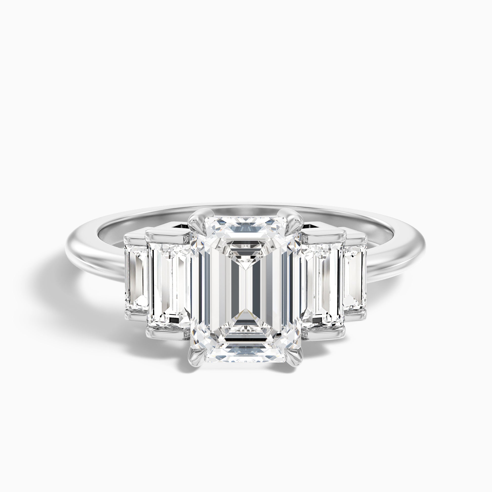 This five stone emerald cut moissanite ring offers significant sparkle. Features five beautiful emerald cut moissanite stones set across the band. Crafted in 925 silver, platinum, or 10k, 14k, or 18k white, yellow, or rose gold. Available in various carat sizes for a brilliant statement.