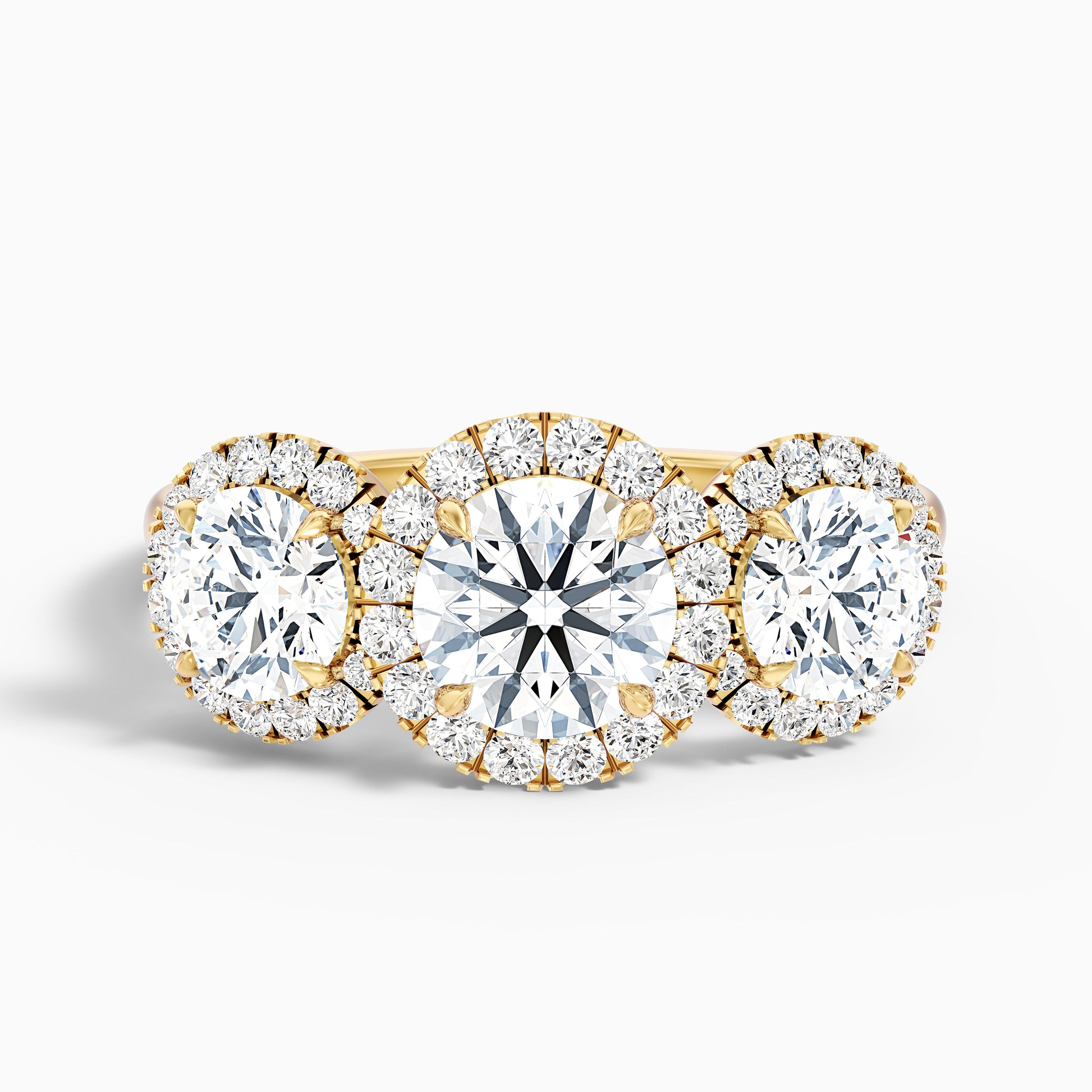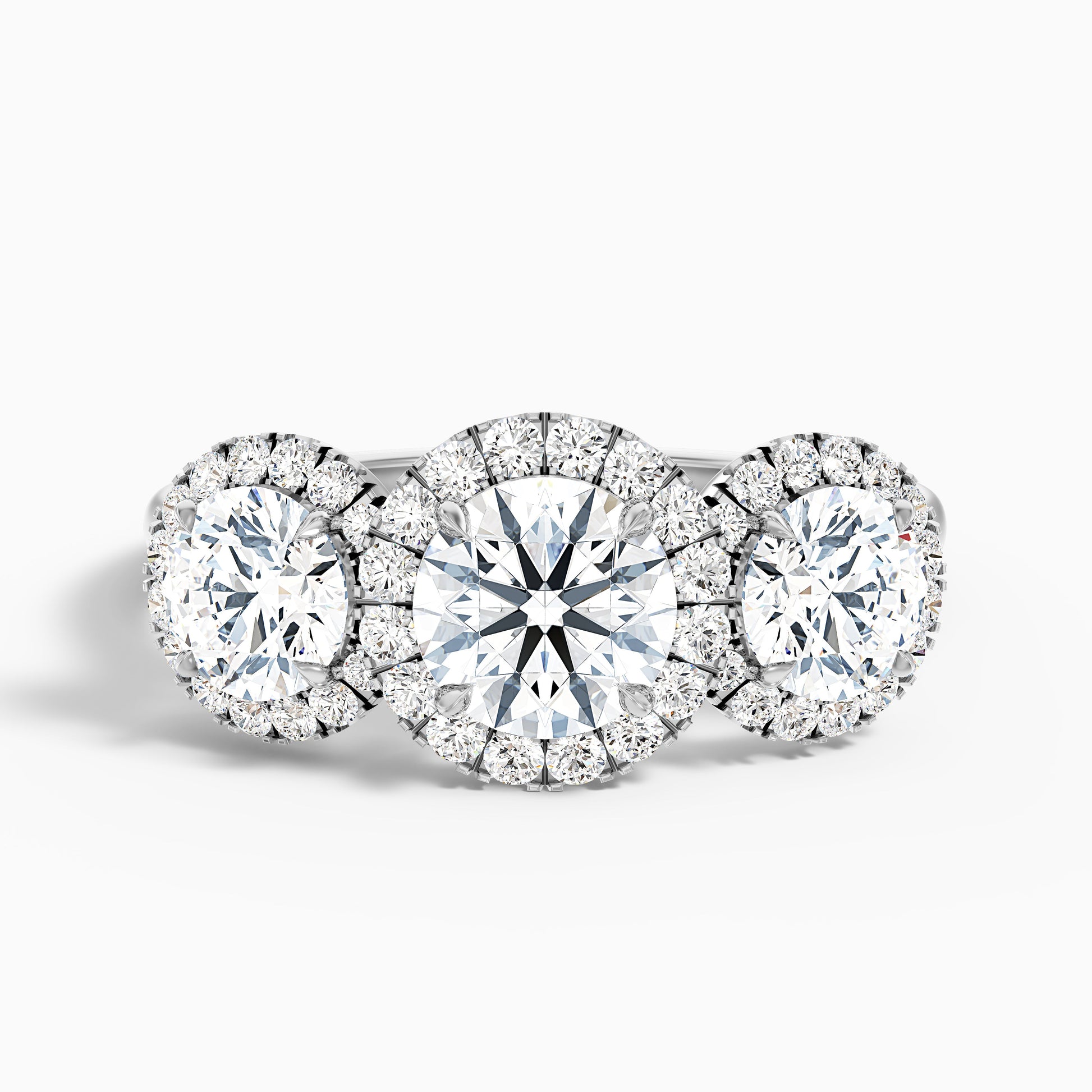 This round three stone with halo lab grown diamond ring offers maximum sparkle. A central round lab grown diamond and two side stones are each framed by glittering halos. Available in 925 silver, or 10k, 14k, or 18k white, yellow, or rose gold. Choose from various carat sizes for a radiant ring.