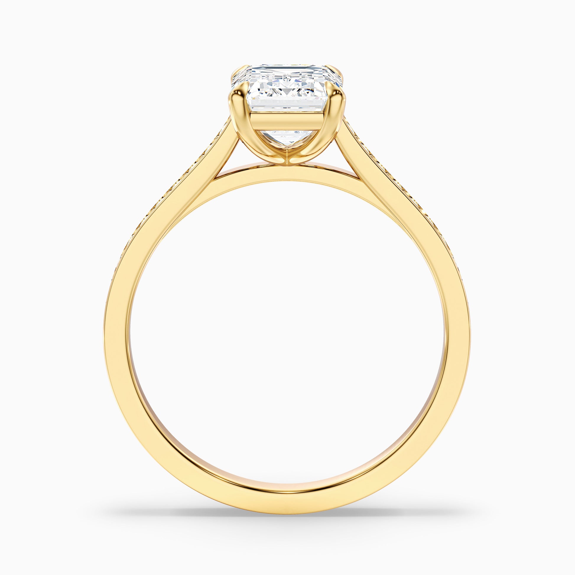 This emerald side stone channel set lab grown diamond ring offers sophisticated style. Featuring a stunning emerald cut lab grown diamond and sparkling channel set side stones. Crafted in 925 silver, or 10k, 14k, or 18k white, yellow, or rose gold. Select from various carat sizes for a beautiful look.