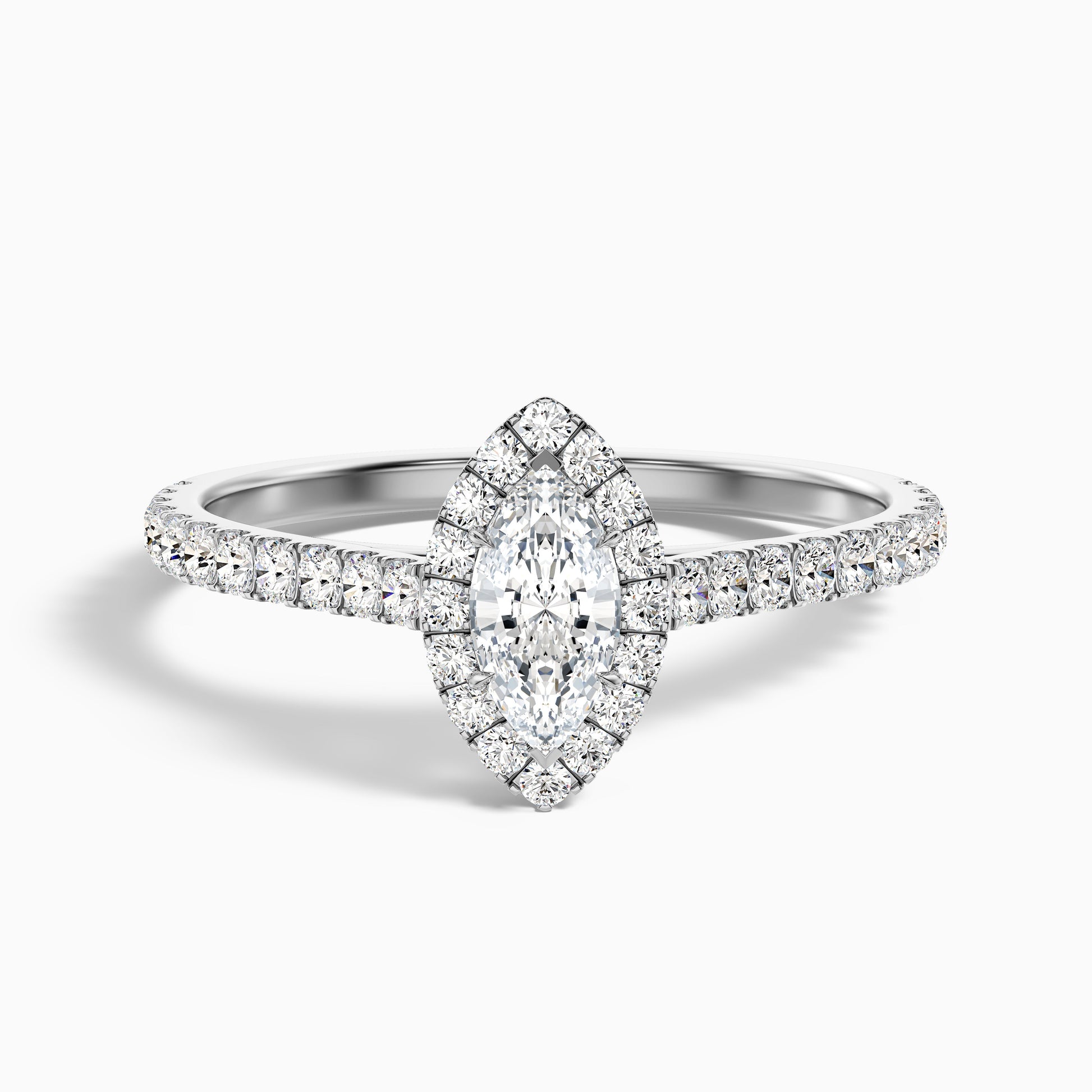 This marquise pave halo lab grown diamond ring offers unique sparkle. Features a captivating marquise cut lab grown diamond framed by a glittering pave halo. Crafted in 925 silver, or 10k, 14k, or 18k white, yellow, or rose gold. Available in various carat sizes for a distinctive look.