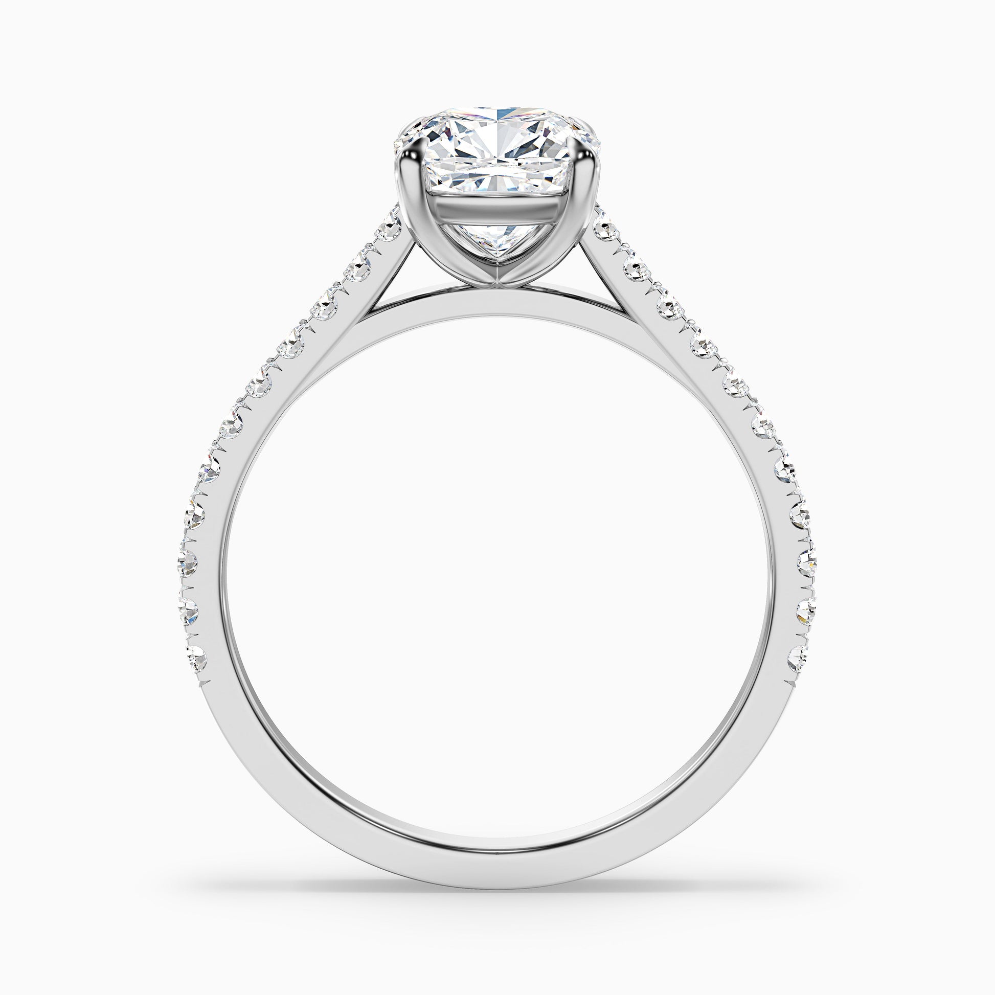 This cushion side stone lab grown diamond promise ring offers beautiful detail. Features a lovely cushion cut lab grown diamond accented by sparkling side stones. A perfect symbol of commitment. Available in 925 silver, or 10k, 14k, or 18k white, yellow, or rose gold. Choose from various carat sizes.
