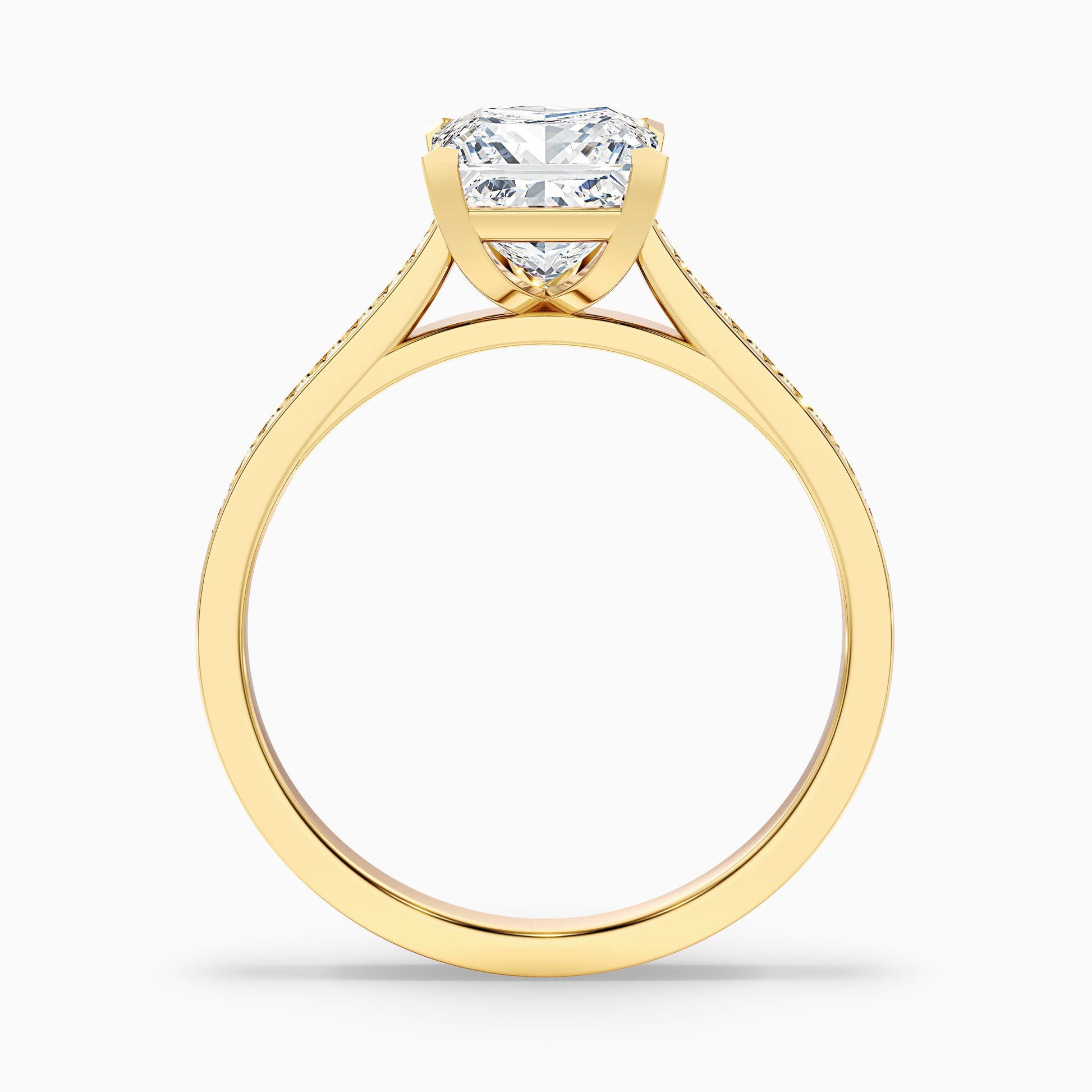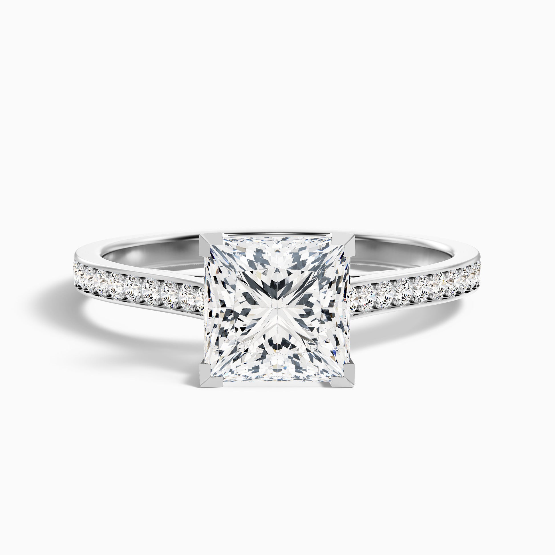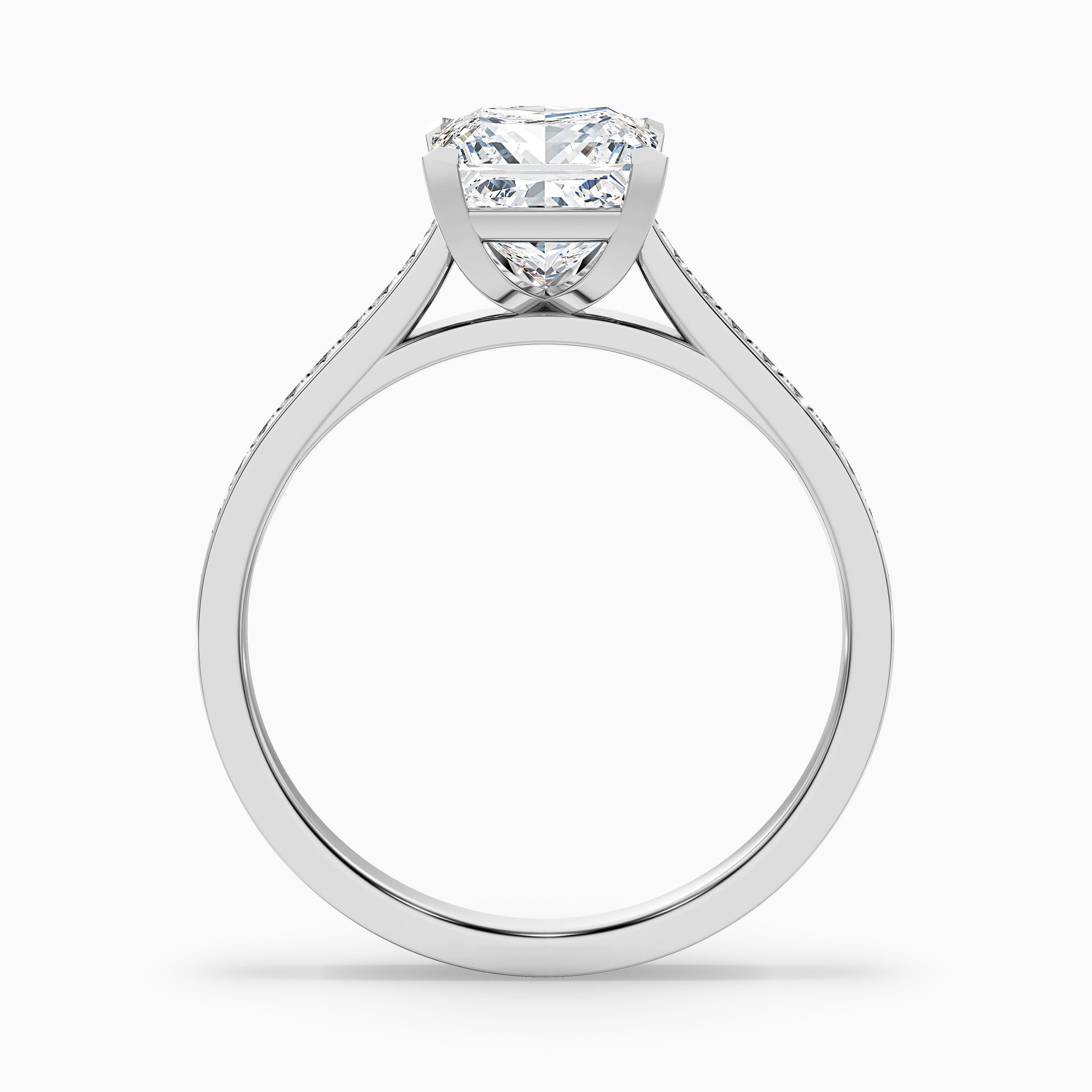 This princess side stone channel set moissanite ring combines shape and sparkle. Features a stunning princess cut moissanite with shimmering channel set side stones. Crafted in 925 silver, platinum, or 10k, 14k, or 18k white, yellow, or rose gold. Available in various carat sizes for a striking ring.