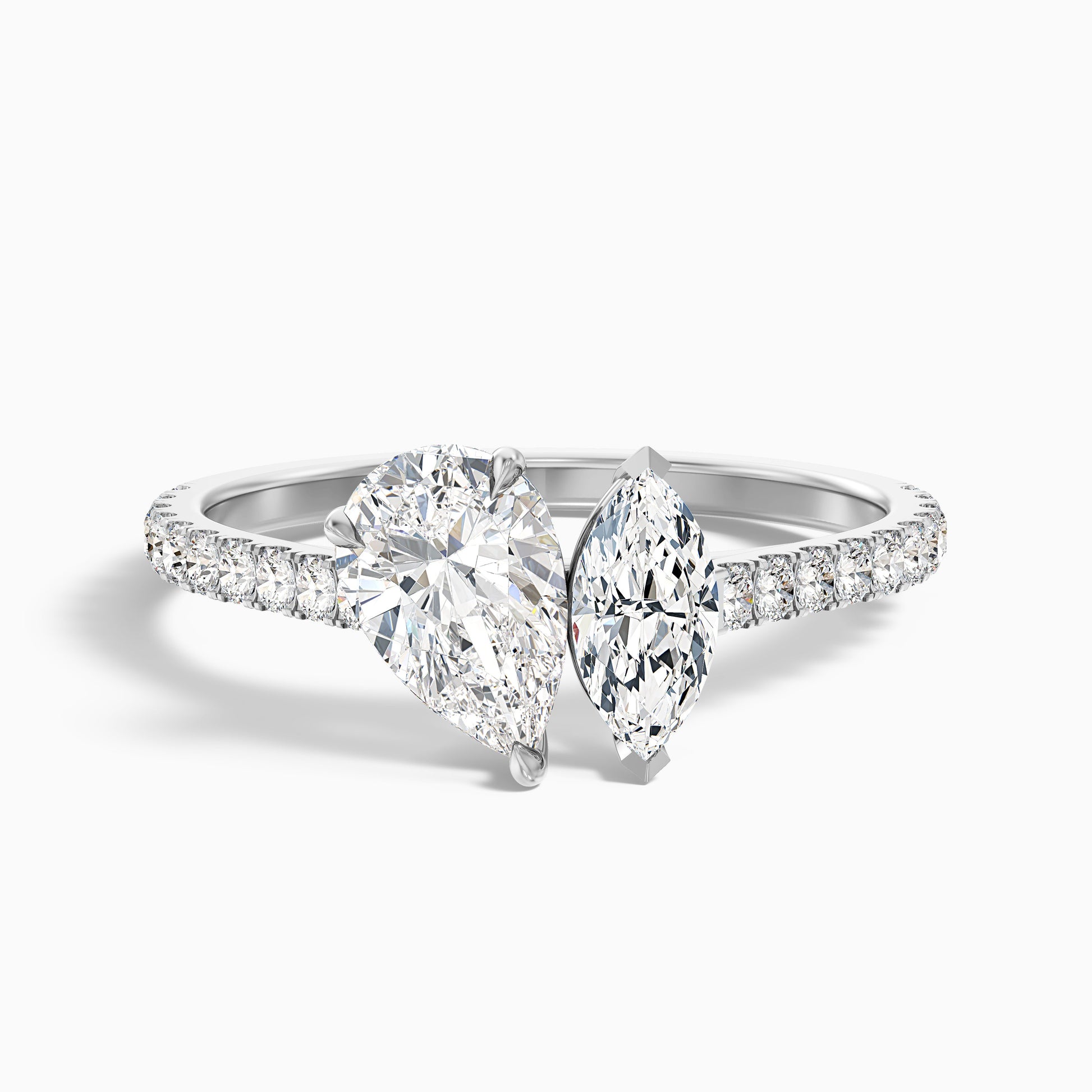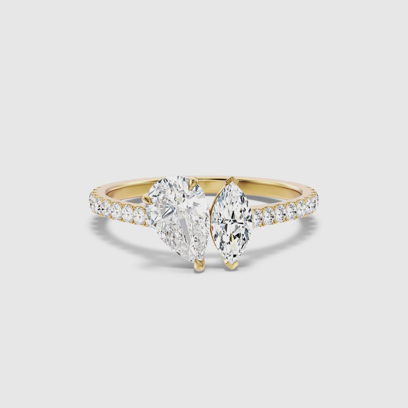This toi et moi lab grown diamond ring combines shapes beautifully. Features a stunning pear cut diamond paired with an elegant marquise cut diamond. Crafted in 925 silver, platinum, or 10k, 14k, 18k white, yellow, rose gold. Available with various carat sizes to symbolize your unique partnership.