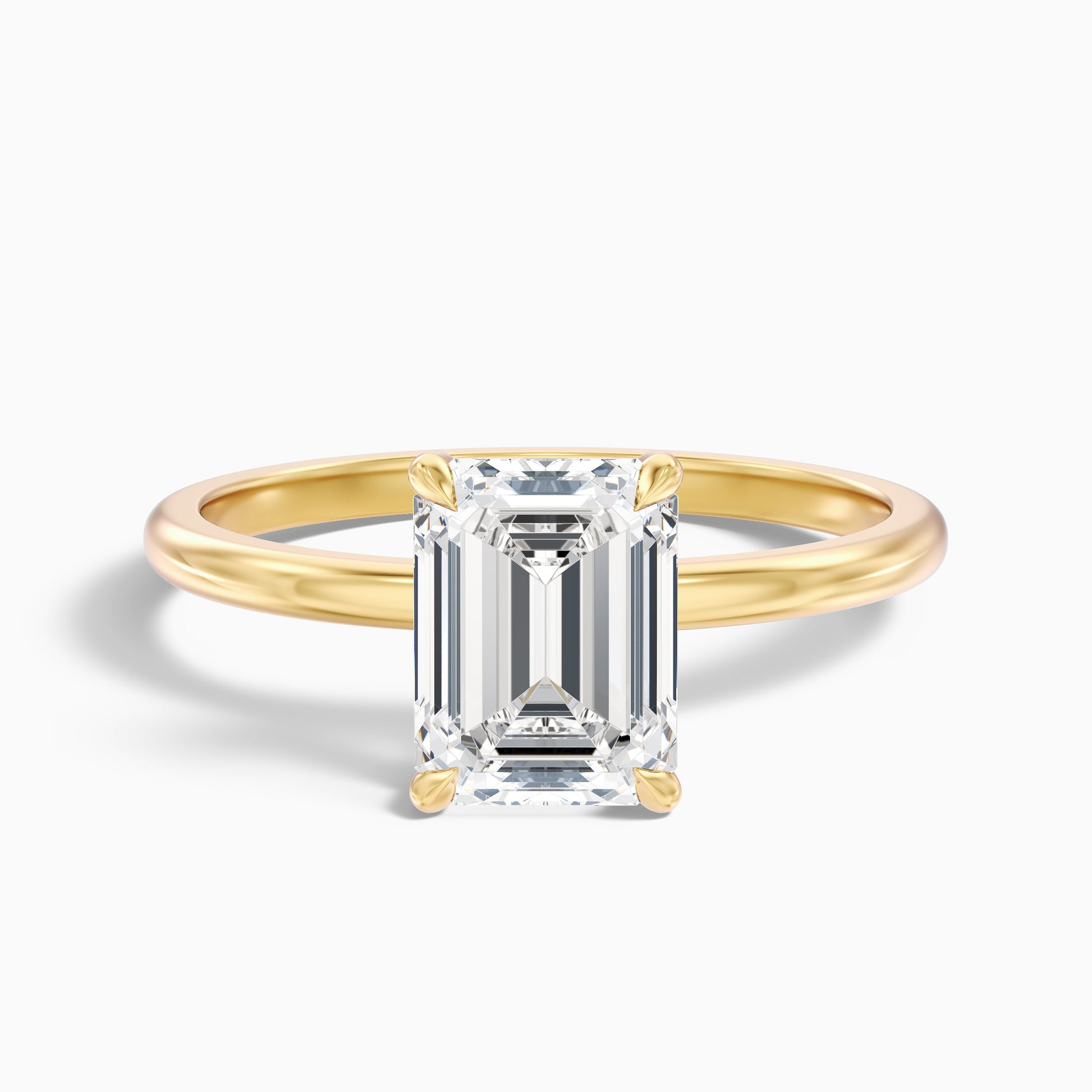 This emerald cut hidden halo lab grown diamond ring offers sophisticated detail. Features a stunning emerald cut lab grown diamond with a subtle hidden halo beneath. Available in 925 silver, platinum, or 10k, 14k, or 18k white, yellow, or rose gold. Choose from various carat sizes for a ring with understated sparkle.