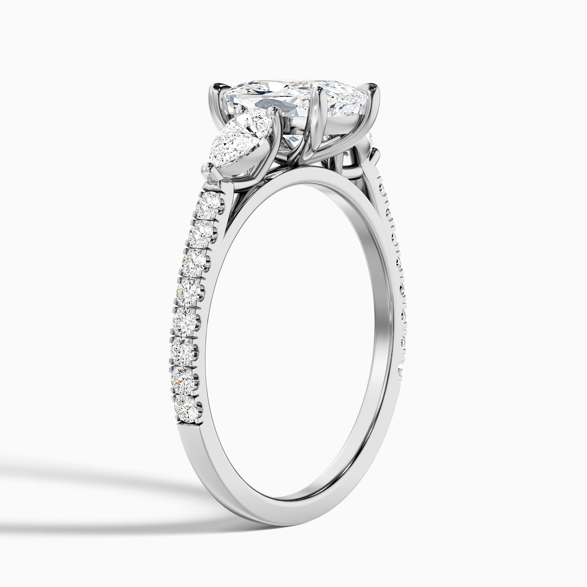 The Zoe elongated cushion cut three-stone lab grown diamond ring features a dazzling trio of diamonds, symbolizing past, present, and future love. Set in 10k, 14k, or 18k gold, sterling silver, or platinum, with additional pave diamonds on the band, this ring radiates elegance and meaning. The elongated cushion center stone draws the eye with its soft corners and brilliant shine.