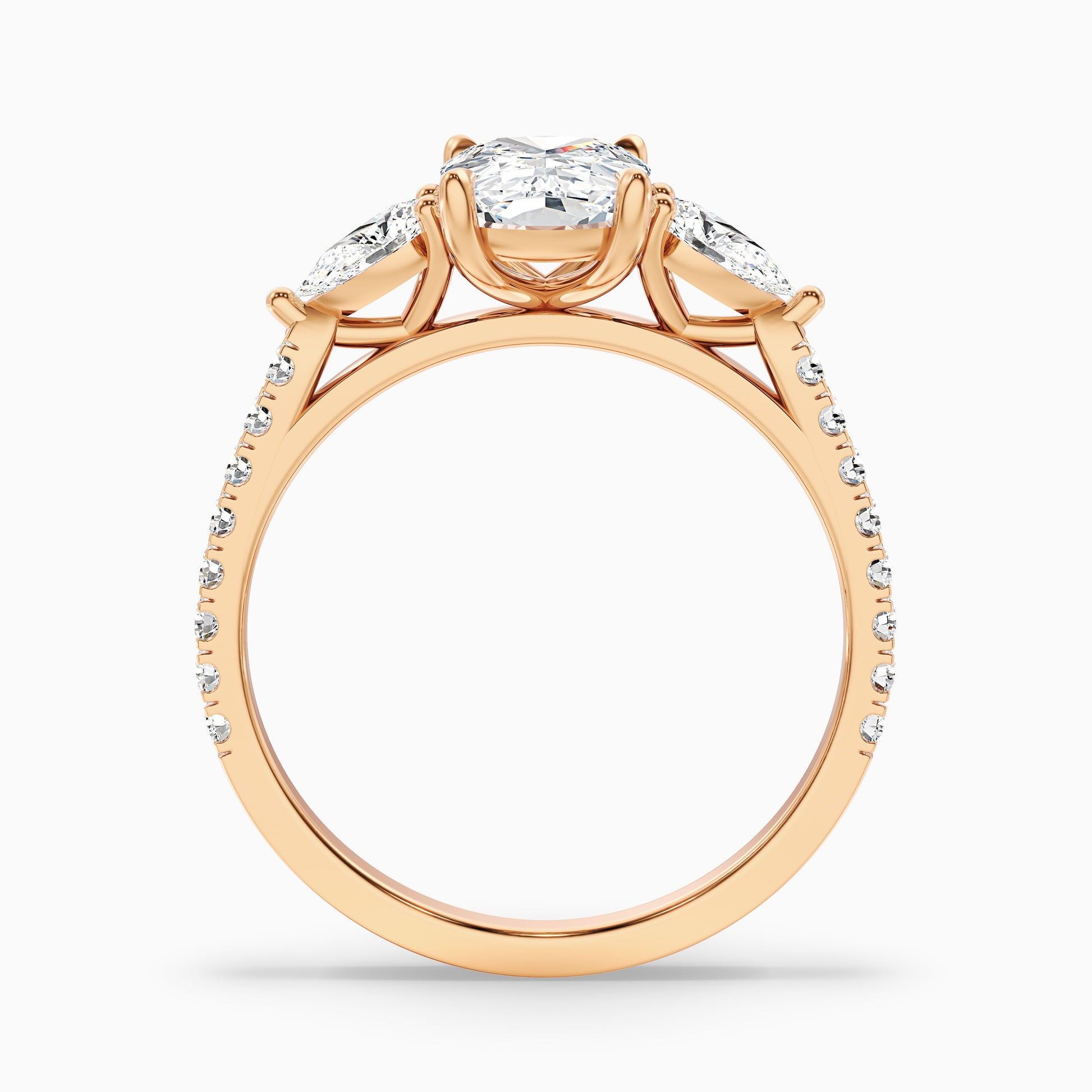 The Zoe elongated cushion cut three-stone pave moissanite diamond ring features a trio of sparkling moissanites symbolizing past, present, and future love. Set in 10k, 14k, or 18k gold, sterling silver, or platinum, with additional pave stones on the shank, this ring radiates romantic luxury.